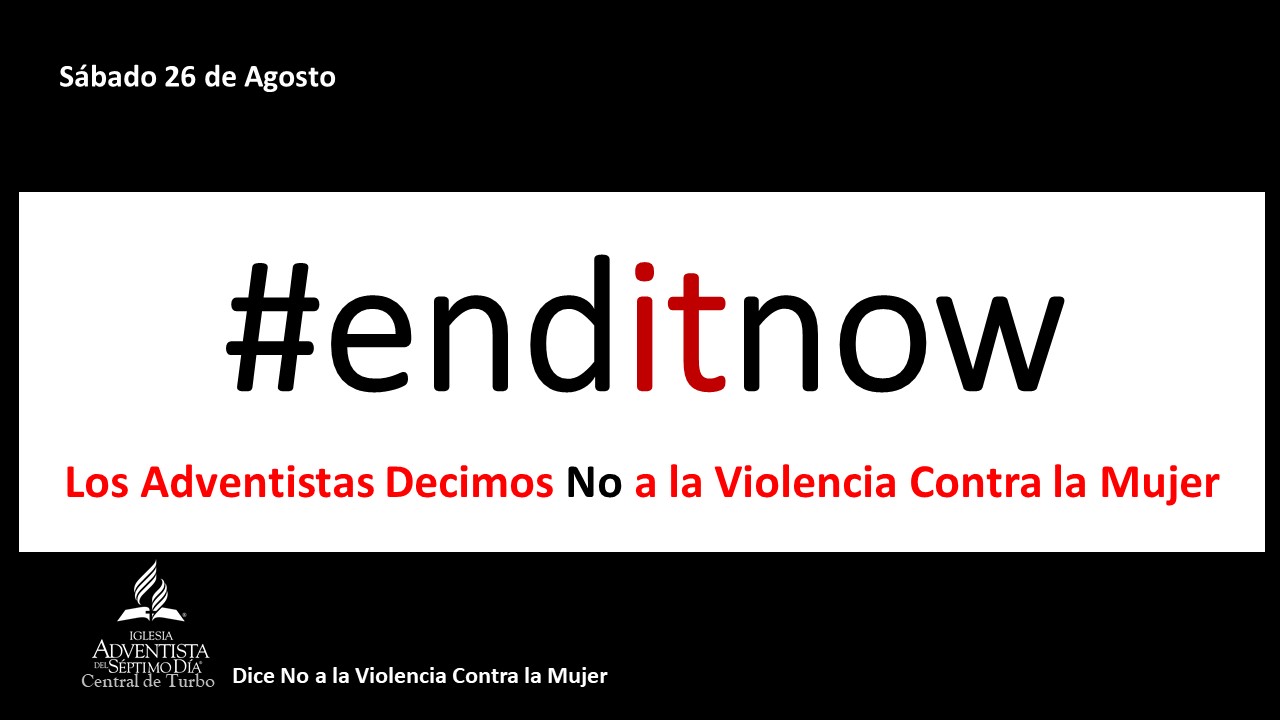La Iglesia Adventista del Séptimo Día reconoce que el abuso y la violencia afecta a niños, mujeres y hombres tanto en la iglesia como en la sociedad en general, por esto desde hace unos años, cada cuarto sábado de agosto es lanzada la campaña enditnow (termínalo ya) como una forma de rechazar todo tipo de violencia. La iglesia Central de Turbo quiere unirse a este esfuerzo, por lo tanto, este próximo 26 de agosto estaremos tomando un momento para compartir en todas las redes sociales el siguiente mensaje “Cualquier tipo de violencia debe terminar y tú puedes hacer la diferencia #EndItNow”. La actividad la terminaremos con una oración especial por aquellas personas que son víctimas de cualquier tipo de violencia.