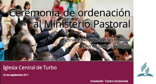 Este 23 de septiembre se estará llevando a cabo la ceremonia de ordenación al ministerio pastoral del pastor Jorge García. Este evento tendrá lugar en la Iglesia Adventista Central de Turbo. En la ceremonia estarán los pastores, dirigentes y administradores del campo local y está invitada toda la membresía de la iglesia del distrito y de otros campos.